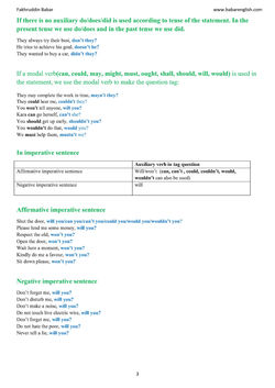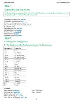 They consist of a statement and a tag . A negative tag is used with an affirmative statement whereas a positive tag is used with a negative statement.